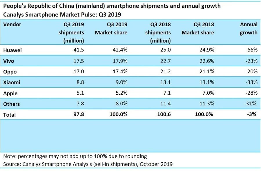 随着华为加大对国内市场的投入,以及在消费者情怀的加持下,华为手机在国内市场取得了意料之中的爆发式增长。科技市场研究公司Canalys最新发布的数据显示,2019年第三季度,华为在中国智能手机市场同比增长高达66%,而VIVO、OPPO、小米和苹果均出现大幅下滑,华米OV和苹果之外的市场空间也进一步萎缩。市场调研机构Countpoint最新发布的数据也与此相近,手机行业的这个寒冬更冷了。