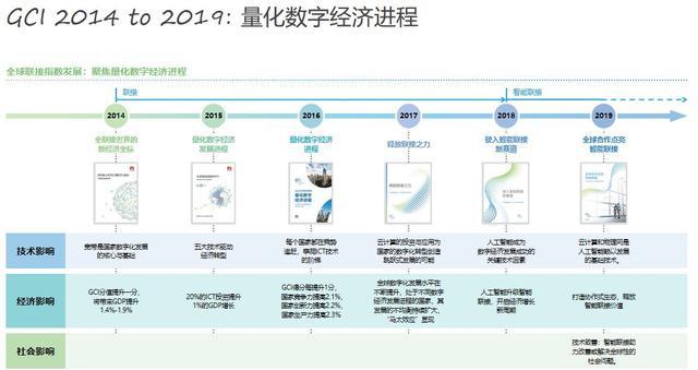 全球联接指数六年的概览图,事实上是一个新技术不断被纳入、已有技术的不断迭代、ICT技术矩阵不读寻找新的平衡点和发展动力的进程。比如2014年首次发布着重探讨联接技术,2017年首次探讨云计算,2018年引入AI。这个进程中,还伴随着经济趋势的发展、产业方法论的迭代,以及新产业新社会价值的迸发。