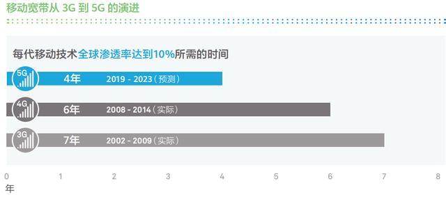 研究表明,当新一代移动网络的全球市场渗透率超过10%以后,经济将出现爆炸式增长。但每一代移动技术的全球渗透率达到10%所需的时间却各不相同:3G网络的部署用了7年时间,即到2009年才达到10%的全球渗透率,而4G网络的部署则用了6年时间。全球联接指数2019预测5G网络的部署仅需4年就能达到10%的全球渗透率。