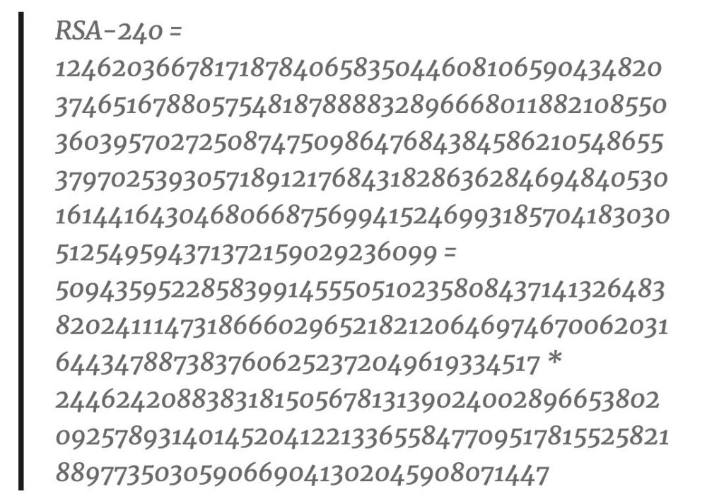 在此之前,人类破解的最长RSA密钥是2010年解开的RSA-768(尽管位数比RSA-240更小,有232个十进制位和768个二进制位),以及2016年的768-bit素数离散对数的计算。