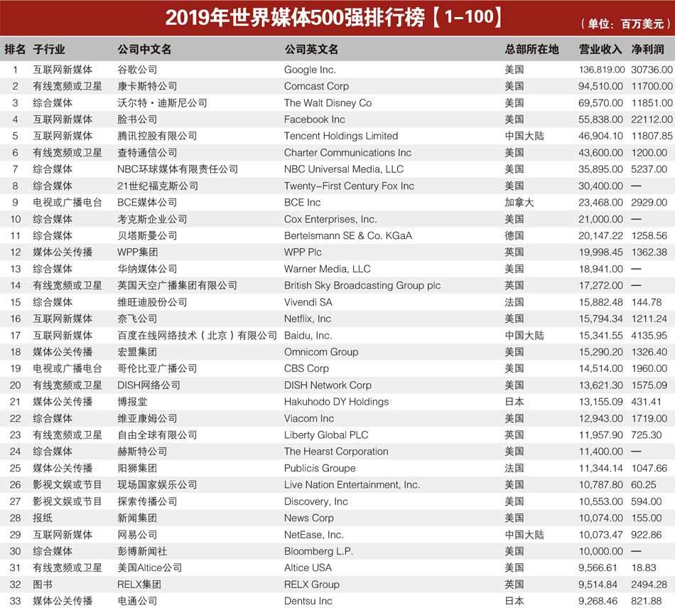 12月17日,由世界媒体实验室评选的2019年度“世界媒体500强”排行榜在美国纽约揭晓,浙江日报报业集团、凤凰卫视和华闻集团连续7年入选。今年,中国共有95家媒体公司入选,较去年增加6家,腾讯、百度、网易名列中国大陆前三。