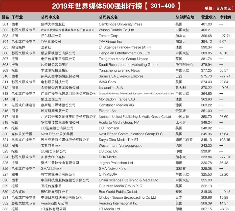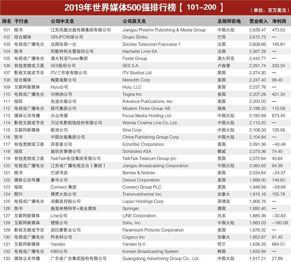 据悉,本次评选对象覆盖美洲、欧洲和亚洲40多个国家和地区的3000多家媒体公司,以营业收入为主要指标进行排名,涉及电视或广播电台、报纸、图书、期刊、互联网新媒体、有线宽频或卫星、综合媒体、影视文娱或节目及媒体公关传播共9个子行业。
