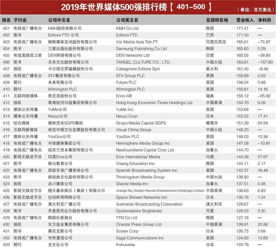 2019年度“世界媒体500强”是世界品牌实验室第七次以全球媒体公司为对象展开评选。入选品牌最多的3个国家分别是美国、中国、英国,电视或广播电台、图书、报纸是入选数量最多的3个媒体子行业。