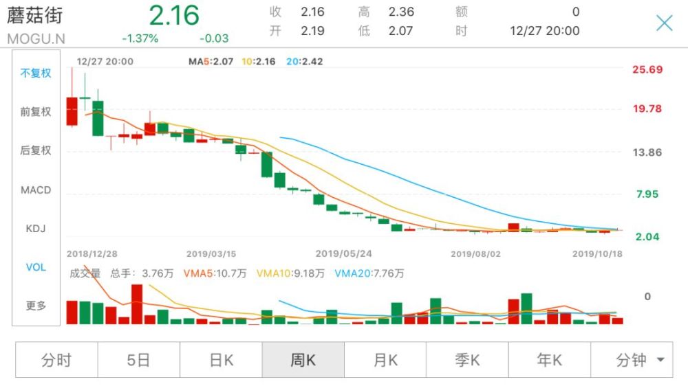 今年以来,蘑菇街股价累计下跌89%,每股股价仅有2.16美元,最新市值为2.31亿美元,股价蒸发逾130亿人民币。