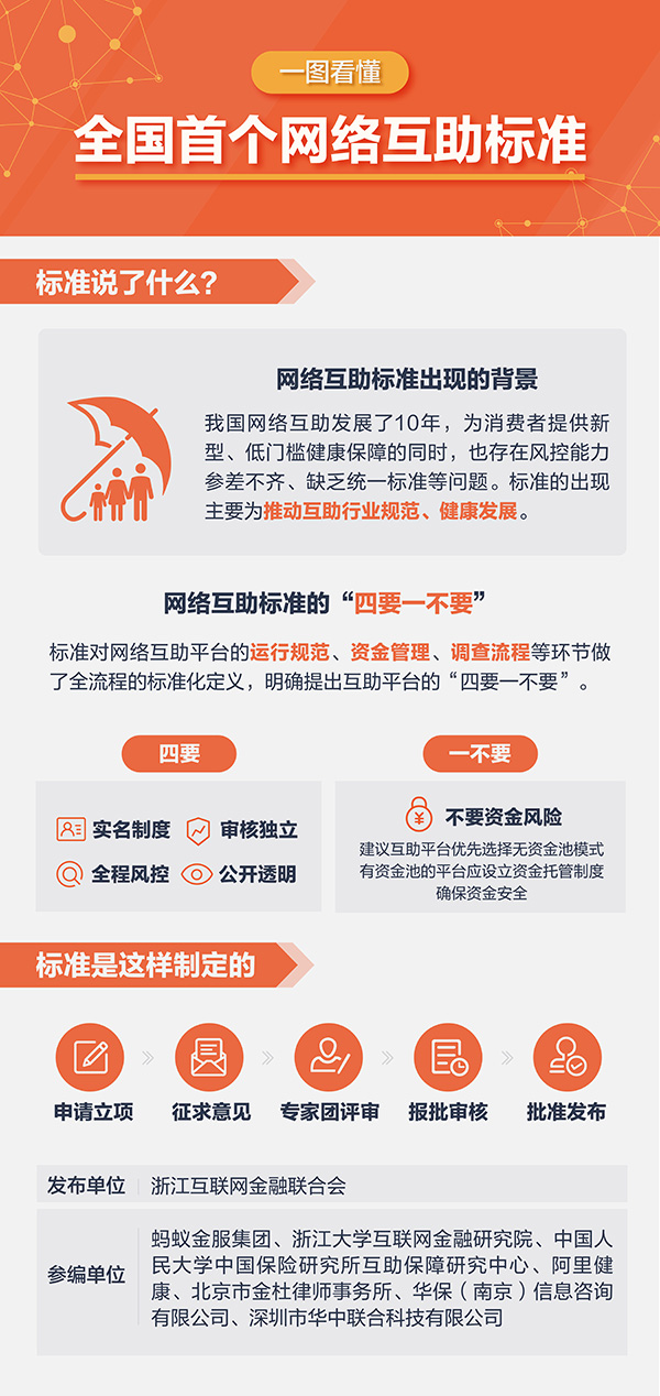 3月30日,浙江互联网金融联合会批准发布了全国首个网络互助团体标准。这一标准由蚂蚁金服牵头,联合了浙江大学互联网金融研究院、中国人民大学中国保险研究所互助保障研究中心、阿里健康等6家产业、学术、研究机构共同制定。