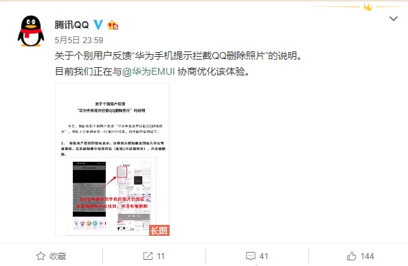 5月5日晚间,腾讯QQ官方发布了关于个别用户反馈“华为手机提示拦截QQ删除照片”的说明。目前正在与华为EMUI 协商优化该体验。